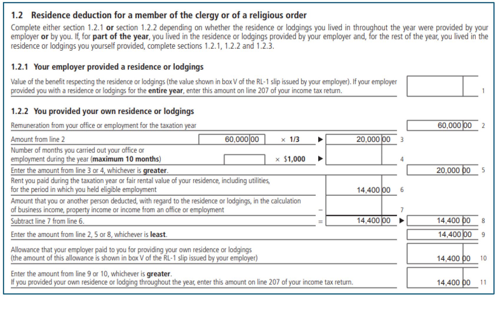 When a member of the clergy owns or rents their home, the residence deduction is calculated using the same general rules for both the federal (CRA) and Quebec (Revenu Québec) tax returns. The deduction is determined as the lowest of the following three amounts: