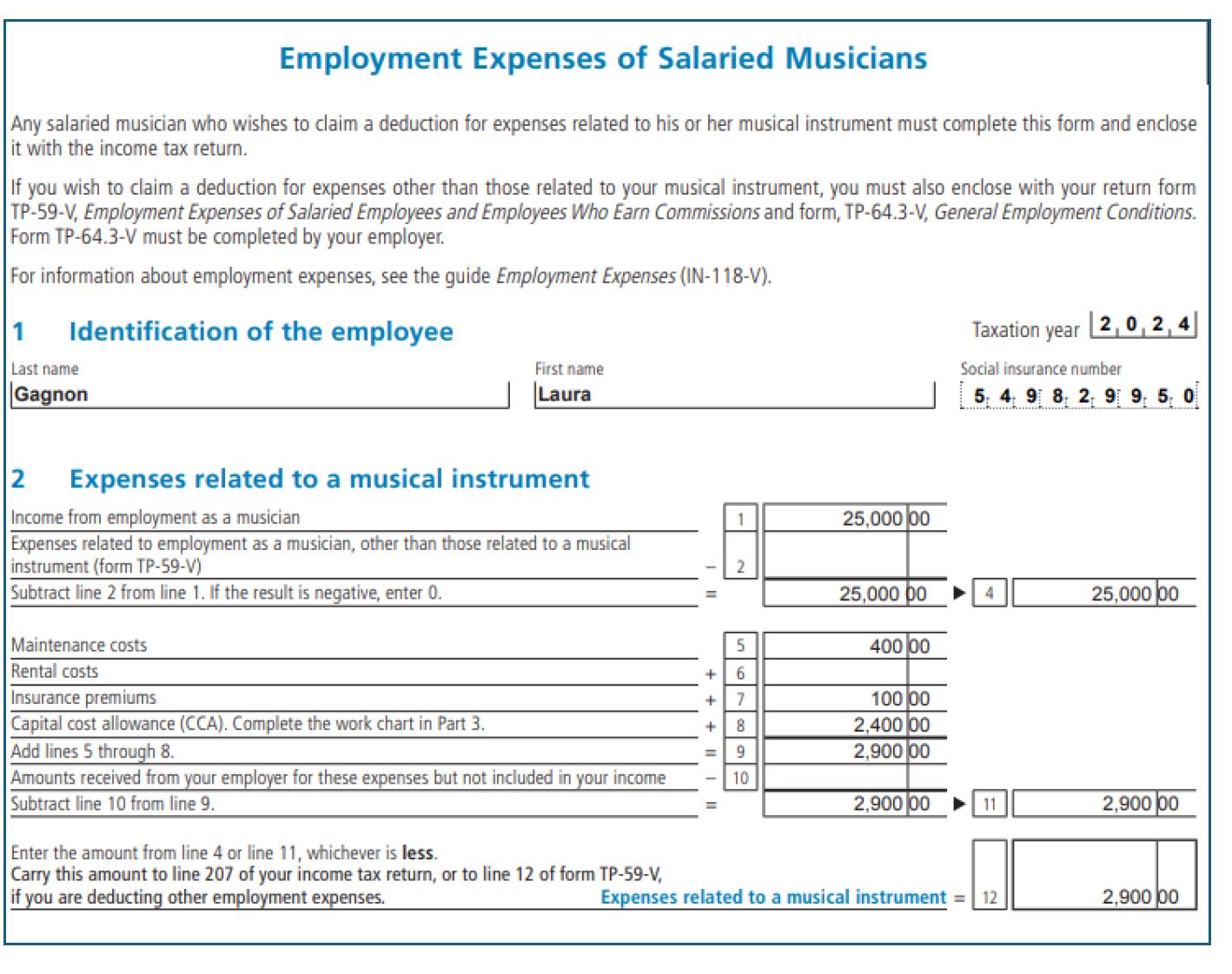 | Musical Instruments & Supplies | Deduct the cost of instruments, strings, sheet music, and other work-related supplies. Capital cost allowance (CCA) may apply for instruments. | Same; reported on Form TP-59-V with employer certification on TP-64.3-V. |