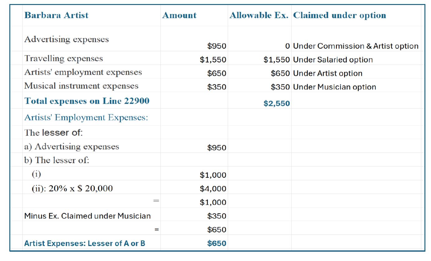 Expenses may be deducted for earning employment income from artistic activities if composed, performed, created, or participated in certified professional artistic work, excluding reproductions.Example :