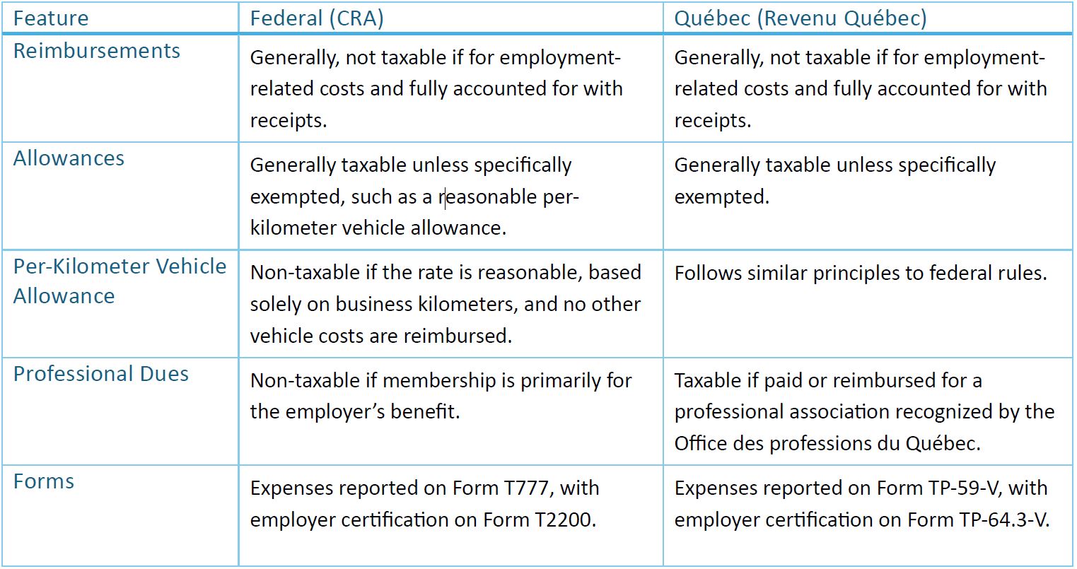 Reimbursements and allowances from an employer are treated differently for tax purposes, both federally and in Quebec. The primary distinction is whether the employee must provide receipts for their expenses. Quebec's tax rules for reimbursements and allowances generally align with the federal approach, but with some specific differences.
