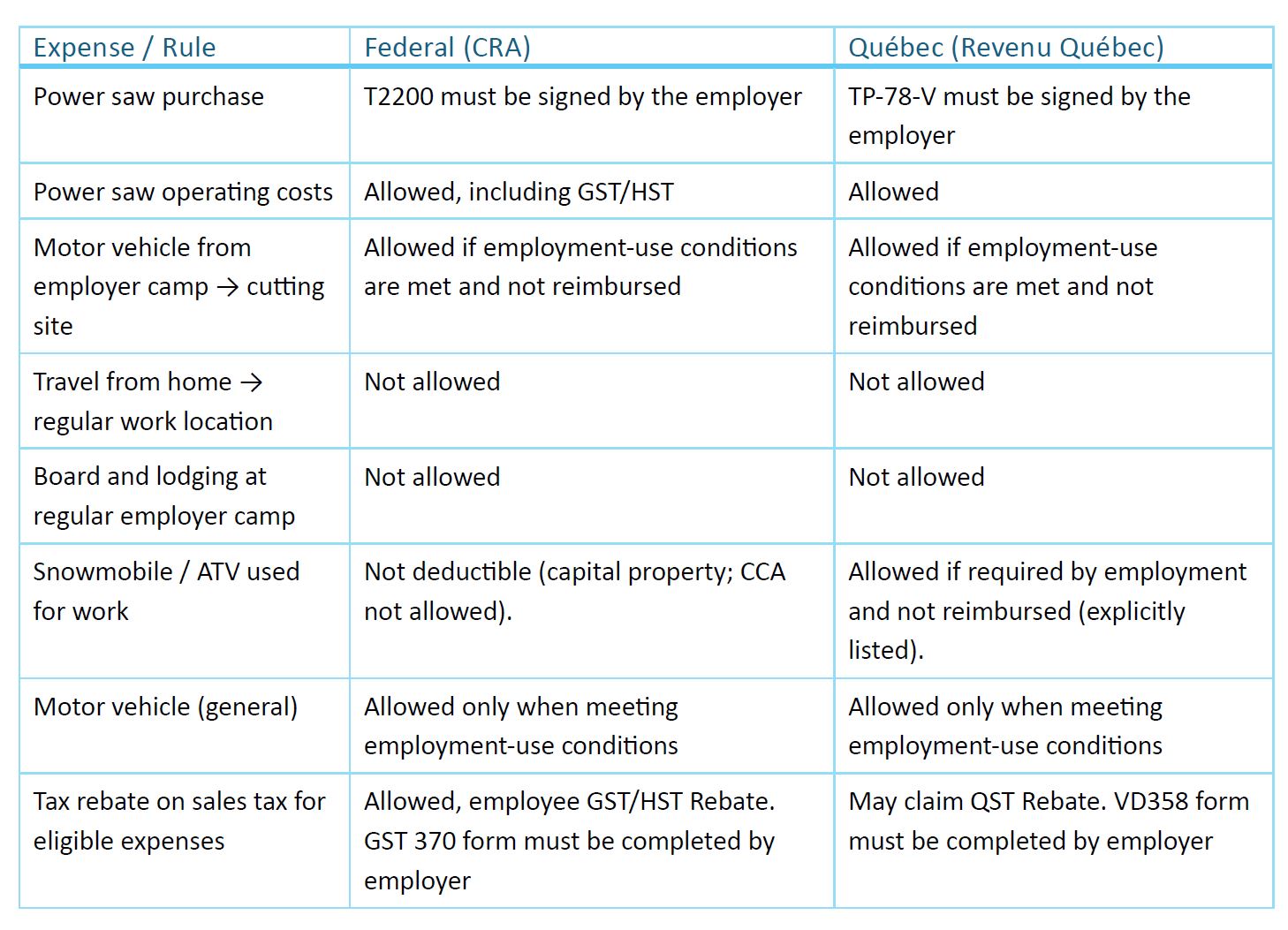 Forestry Work Expenses – Federal (CRA) vs Québec (Revenu Québec)