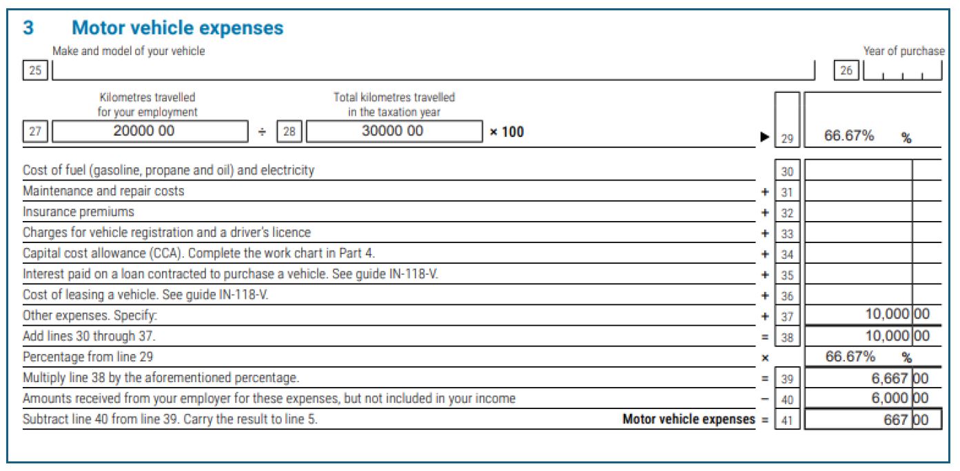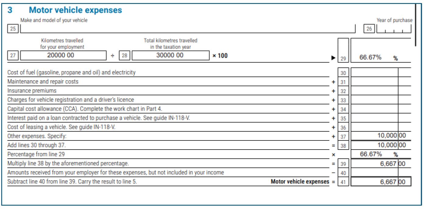 Answer: Business use percentage is 20,000 km ÷ 30,000 km = 66.7%, making deductible expenses $10,000 × 66.67% = $6,667; the net deduction is $6,667 on Line 22900 of T1 return and Line 207 of TP1 return.