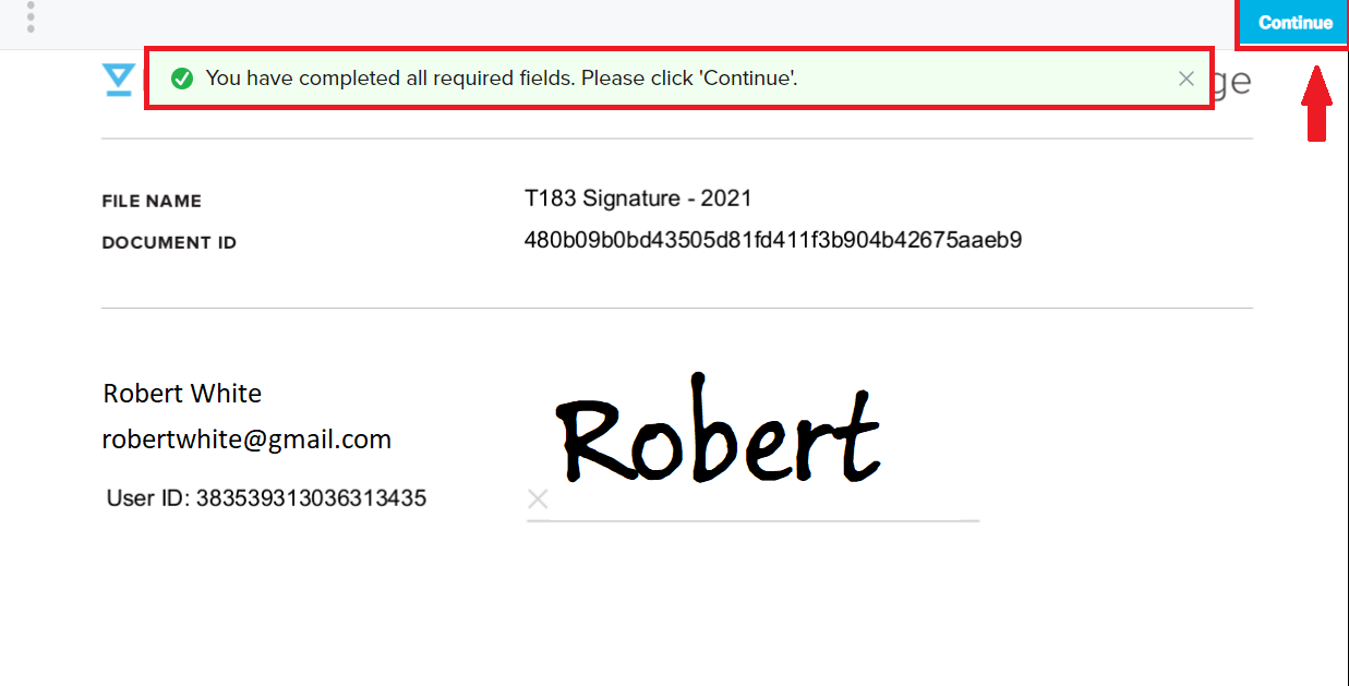 Once the signature is successfully pasted onto the document, the client will be directed to a new screen where they will be notified that they have completed all required fields. By pushing “Continue” on the upper-right hand corner of the screen, the signed document is transmitted to your TaxTron Pro screen.