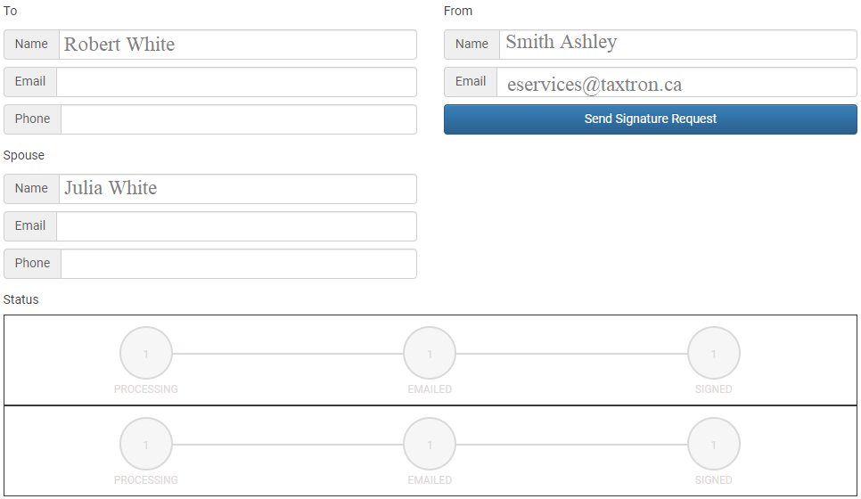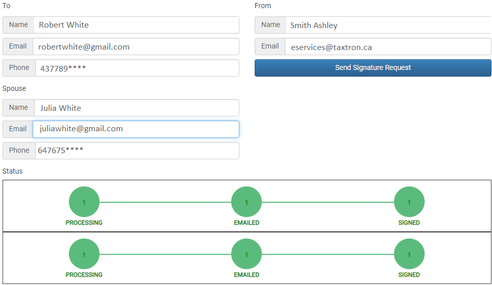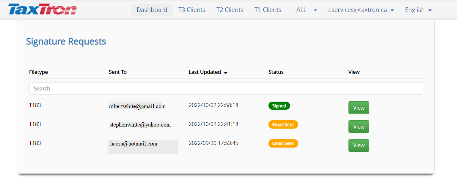 TaxTron has enabled Digital signatures and integrated e-signature feature in its Web based products namely TaxTron Pro T1, T2 and T3. This feature will allow professional accountants to obtain client e-signatures through email and cellular phone. This package is currently offered in TaxTron Web for Tax years 2018 and beyond. The e-signature feature must be bundled (added to the cart) and purchased simultaneously with any TaxTron Pro products.