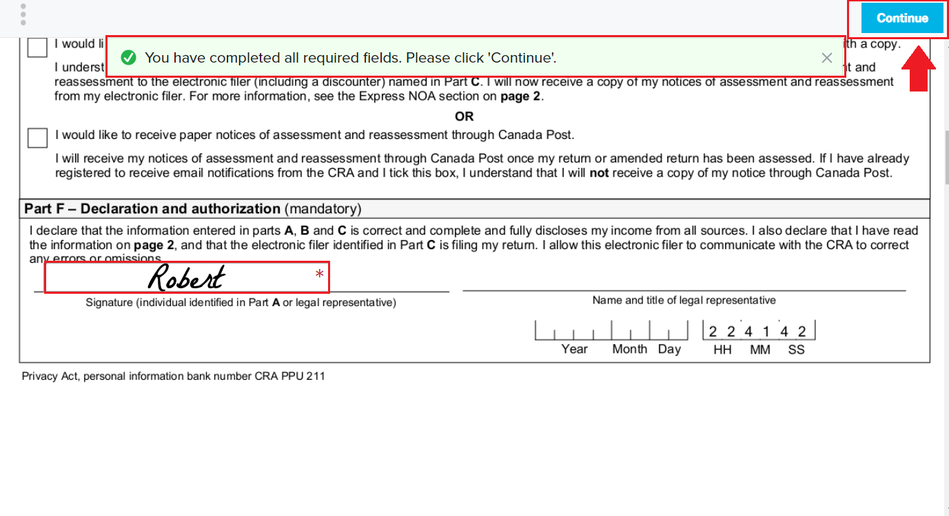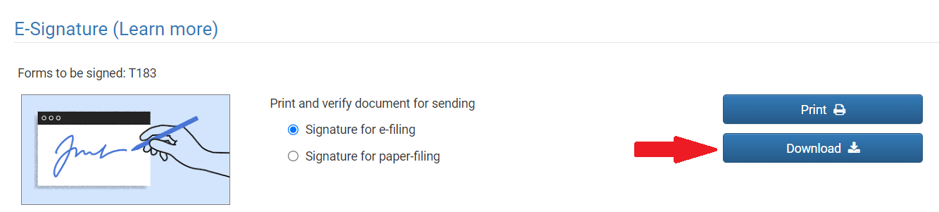 After clicking on the “Sign” button, the client will be directed to a new page where they will be asked to upload their signature. The uploaded signature can be inserted into various forms (T183, T2091, T1032...) and there is no need to upload a new signature each time.